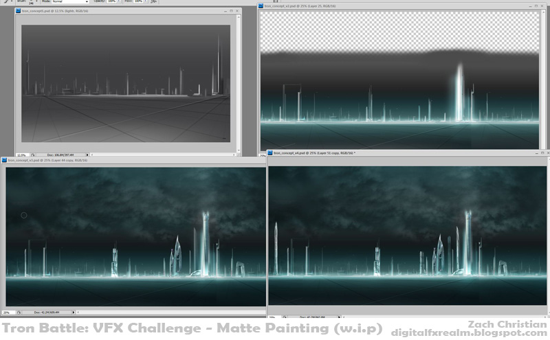 For the creation of the matte painting, Zach used Maya and Photoshop. The Matte Painting Process with just simple sketches in black and white to find composition. By loosly brushing in simple shapes and light color in photoshop he slowly worked his way up to a more conceptual piece. As soon as he felt the composition felt right and the concept was taken to a solid spot he quickly began to compile and block in photo reference to the concept Which let to the final Matte Painting.
