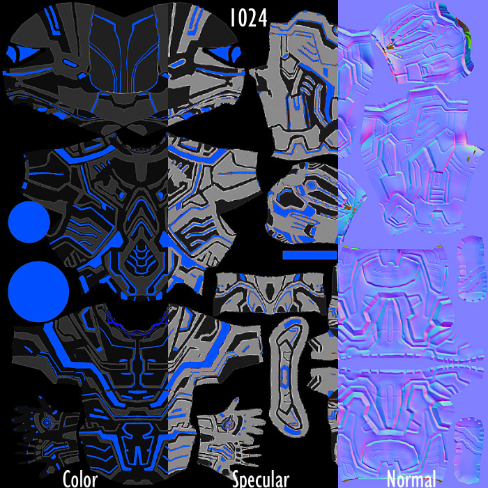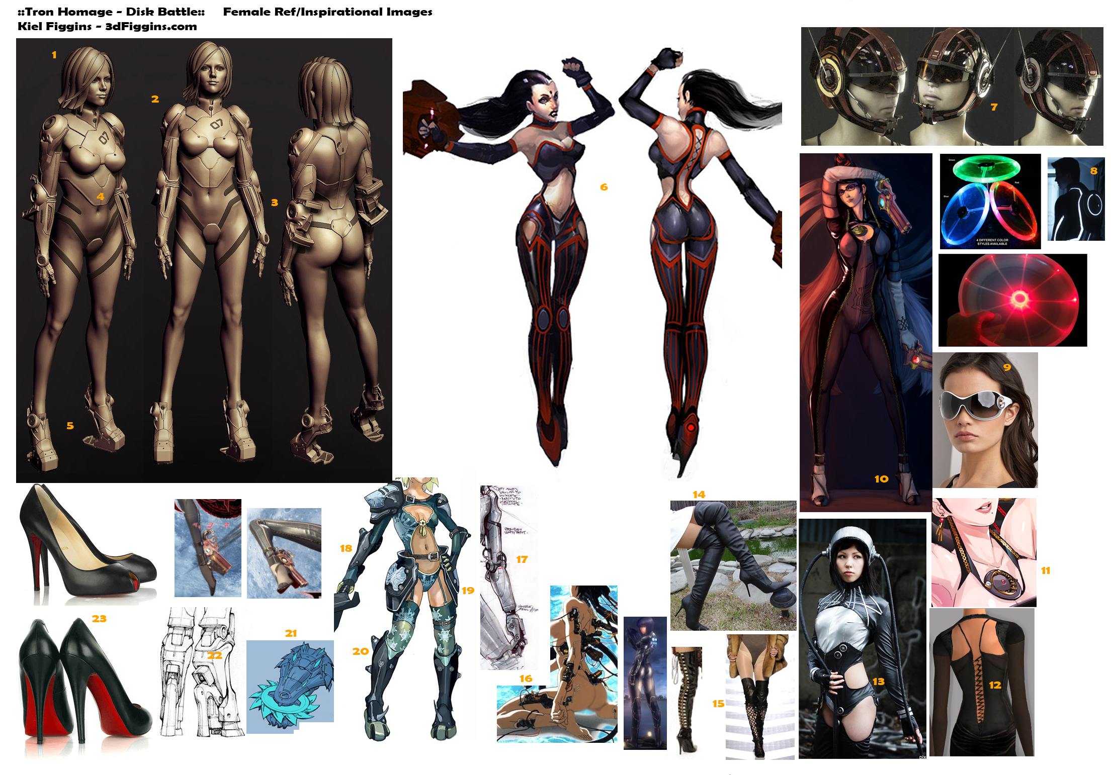 No single concept was provided for the character designs, but rather a collage of various elements and ideas of what would be 'cool' to take the existing Tron Legacy visual and push it in a different direction. Early on it was decided that there would be two different characters, a male and a female. To aid with the short timeline and avoid having to model, setup and animate faces and hair, both characters were created with helmets in mind. The idea of Bellatrix having cords/dreadlocks coming out the back of helmet was briefly explored but later cut due to time restraints.