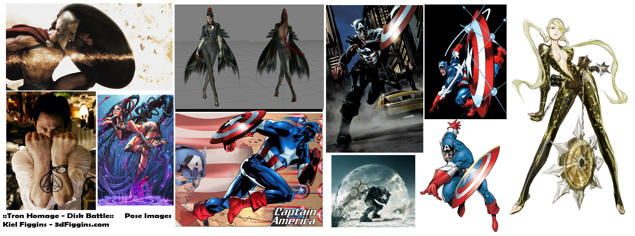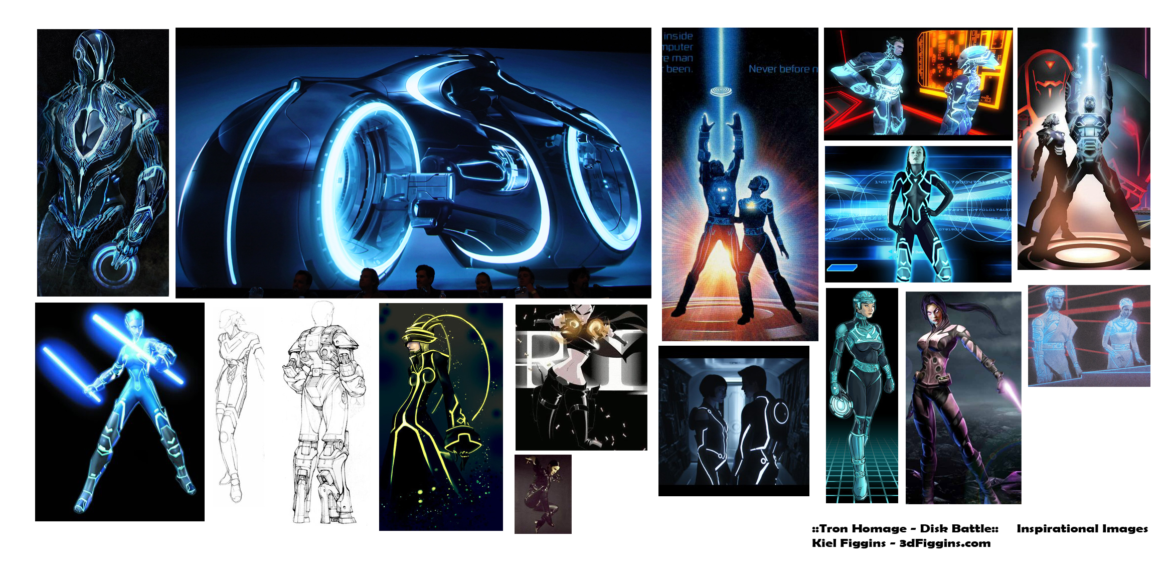 Below is an Inspiration Breakdown of some key elements from the short. Many sources where pulled from, such as video games, nature and pop culture. The use of these pieces helped with keeping the team members on the same page visually while the actions where being roughed out, as well as giving a heads up on potential difficulties in their own areas. Difficulties such as cutting someone in half and having them form two new entities, all while staying in the established Tron visuals.