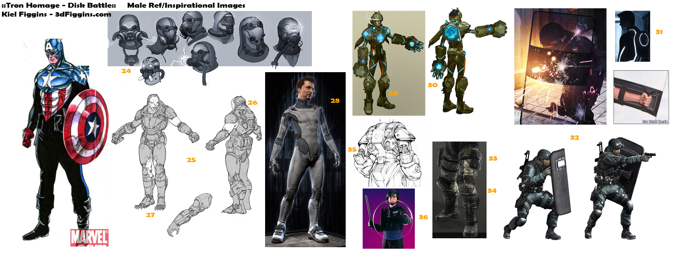 The male character, named Contego, which in latin stands for "Shield, Protect", took the form of a single, heavy disk Combatant. The main inspiration around his character was Captain America: heroic and a heavier build. Contego maintained the idea of a single disk from Tron, but with larger, stronger attacks. Contego also had several uses for his shield. He could have its entirety used as a standard shield and that could be thrown like a discus. He could split the shield in half to use as dual forearm guards, or slam these halves together to form a hexagon orb that protected him and those in close proximity around him.