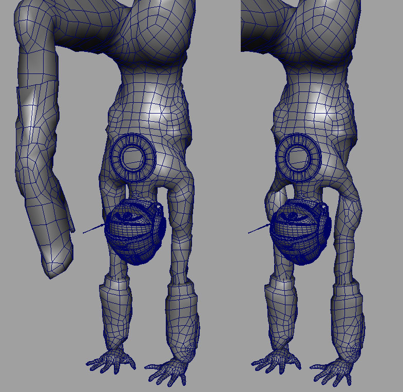 The rig options for squash and stretch would not be used. This prevented forced scaling or collapsing of the human form past what it was capable.